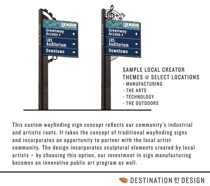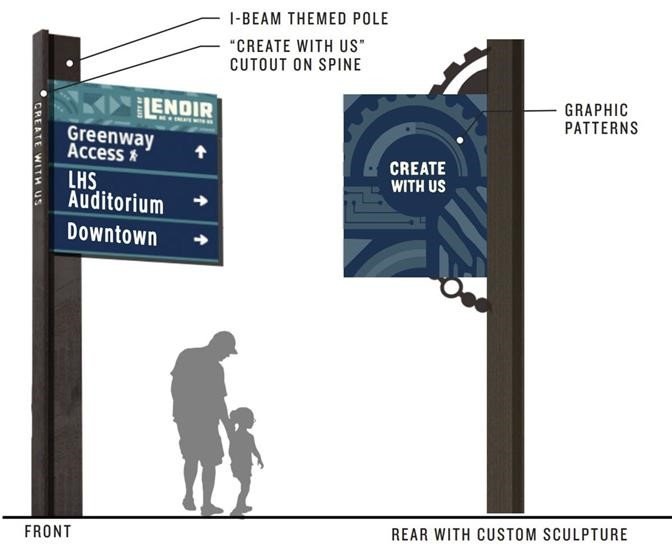 DbD developed a plan on where to locate the signs in the Lenoir. The plan includes 21 locations on the major highways and most traveled streets in the city. The signs in this phase will be large signs, designed to be visible from a car. The design reflects Lenoir’s industrial and artistic roots. The current designs feature a heavy, industrial beam as the main pole with the tagline written down the side and an artistic flourish above and below the main text.