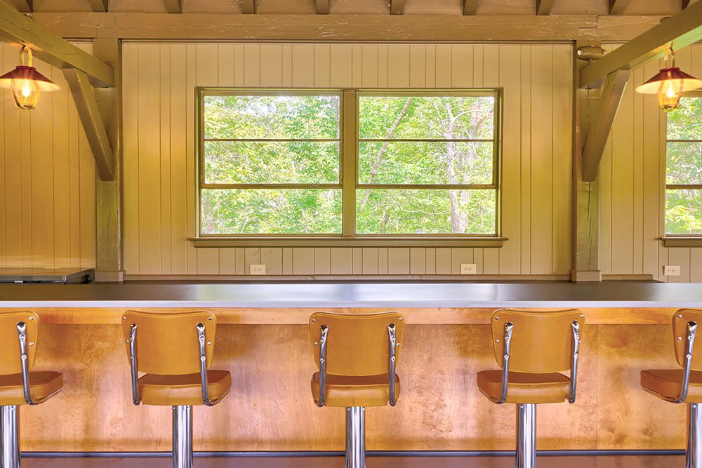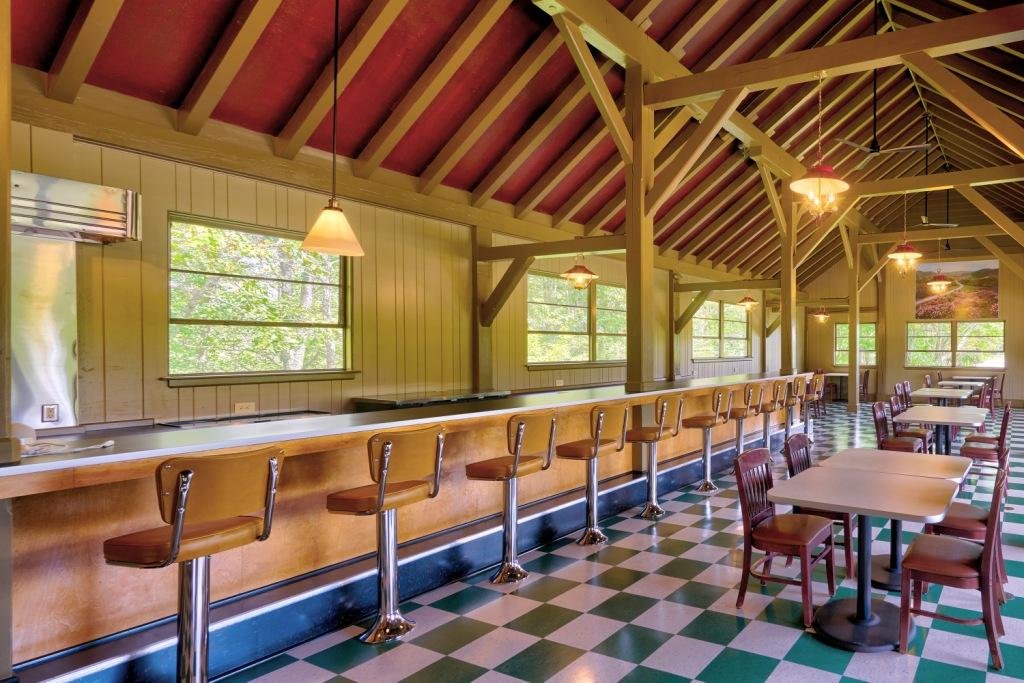 In 1949, The Bluffs became the first dining establishment to open on the Parkway. The former coffee shop welcomed generations of diners before closing in 2010. Last year, the stone and timber building underwent extensive renovations. Today, The Bluffs appears just as many remember it, with green and white checkerboard floors, a retro lunch counter with stools, and the original light fixtures.