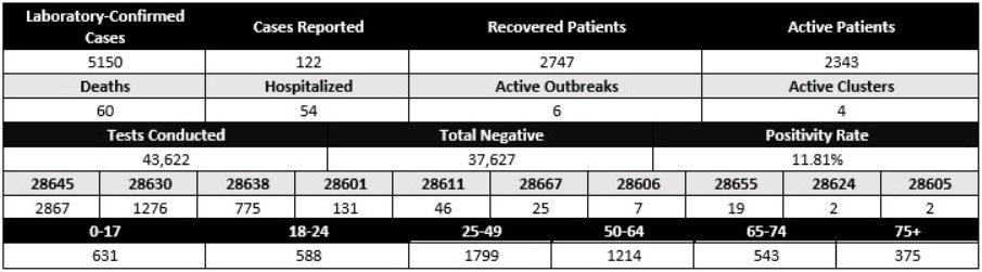One hundred twenty-two cases — 60 in the 28645 Zip code, 41 in 28630, 16 in 28638, three in 28601, one in 28611; and one in 28667 — were reported. Twelve patients are under the age of 17; 15 are between 18 and 24; 28 are between 25 and 49; 43 patients are between 50 and 64; 13 patients are between 65 and 74; and 11 patients are over the age of 75.