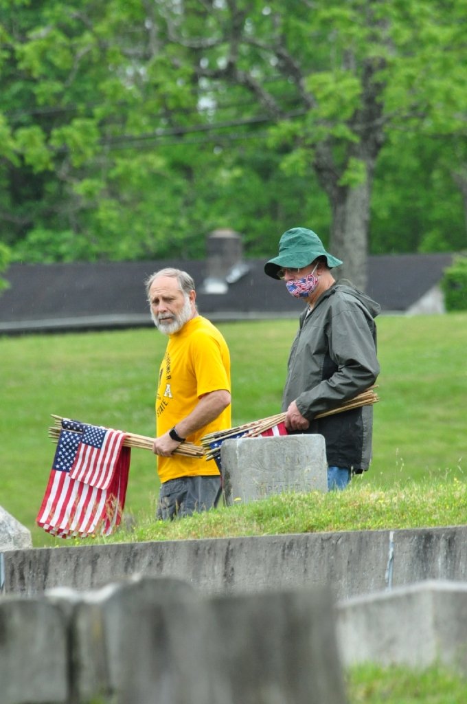 LENOIR, NC (May 18, 2020) — Armed with 400 small American flags, a group of volunteers fanned across the Belleview Cemetery grounds Monday afternoon in the light rain.