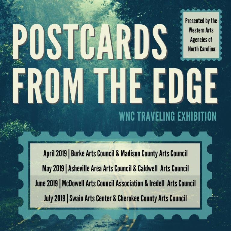 The “Postcards from the Edge” exhibition is coordinated by the Western Arts Agencies of North Carolina (WAANC), whose mission is to strengthen the arts community in Western North Carolina through peer support, shared resources, and collaborative programming. To accomplish this mission, the Western Arts Agencies works diligently to provide services to member organizations; to provide programs that nurture arts administration professionals and to provide programs which support the work of local arts organizations. These programs and mission are accomplished through the efforts of a volunteer board consisting of Western North Carolina arts council executive directors.