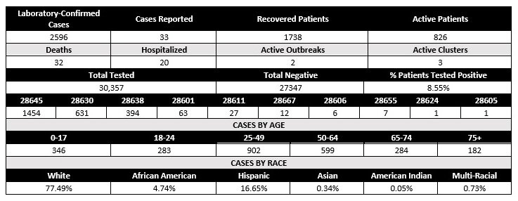 Thirty-three new COVID-19 cases have been reported today — 23 in the 28645 Zip code, four in 28638, five in…