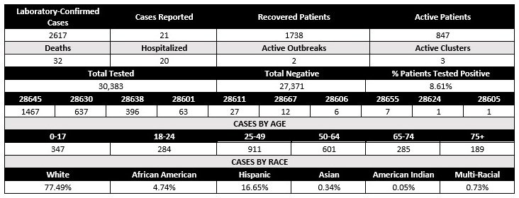 Twenty-one new COVID-19 cases have been reported today — 13 in the 28645 Zip code, two in 28638, and six in…