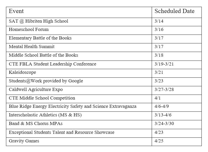 All school-related extracurricular activities and community events held at schools have been suspended until further notice. This includes after school activities like clubs, school dances, and spirit nights held at area restaurants. Special events sponsored or co-sponsored by the Caldwell County Schools are suspended until further notice.