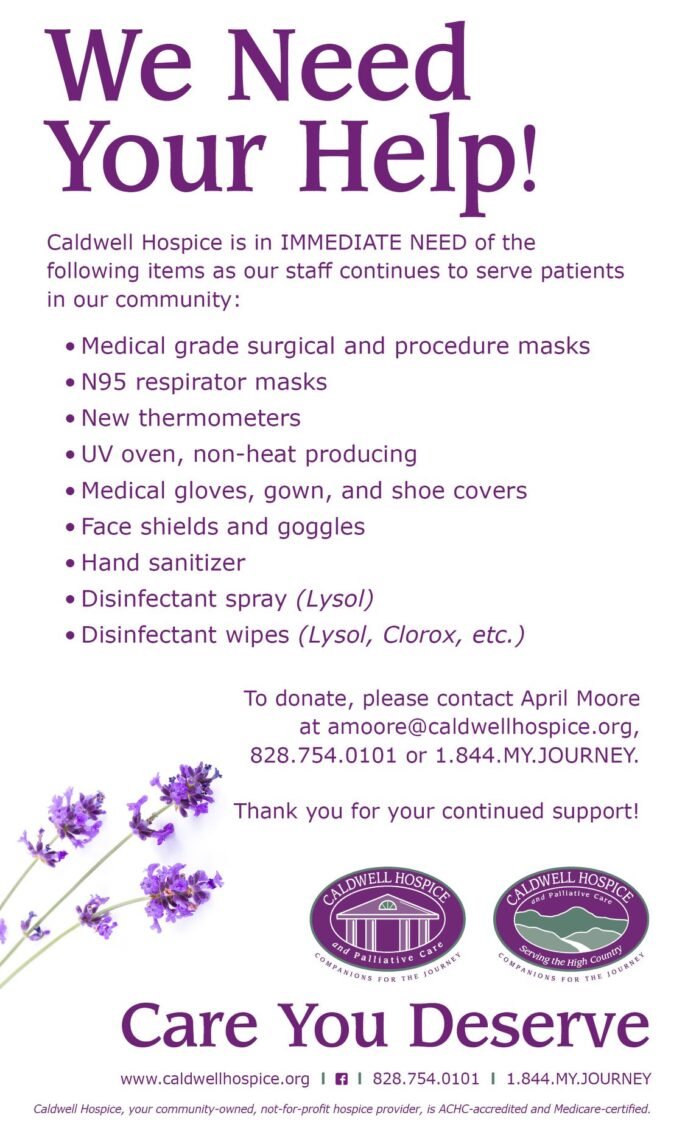 Caldwell Hospice is in immediate need of the following new unopened items as our staff continues to serve patients in our community: