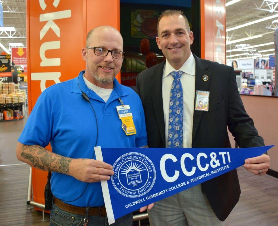 HUDSON, NC (October 26, 2018) — Caldwell Community College and Technical Institute was recently awarded $500 from Walmart’s Community Grant Program. The award will help fund student tutoring services in the Academic Support Center. Pictured from left to right are Jason Rausch, Assistant Store Manager at the Lenoir Walmart, and CCC&TI President Dr. Mark Poarch. “We appreciate Walmart’s support and value their partnership in creating new opportunities for student success in Caldwell and Watauga counties,” Poarch said.