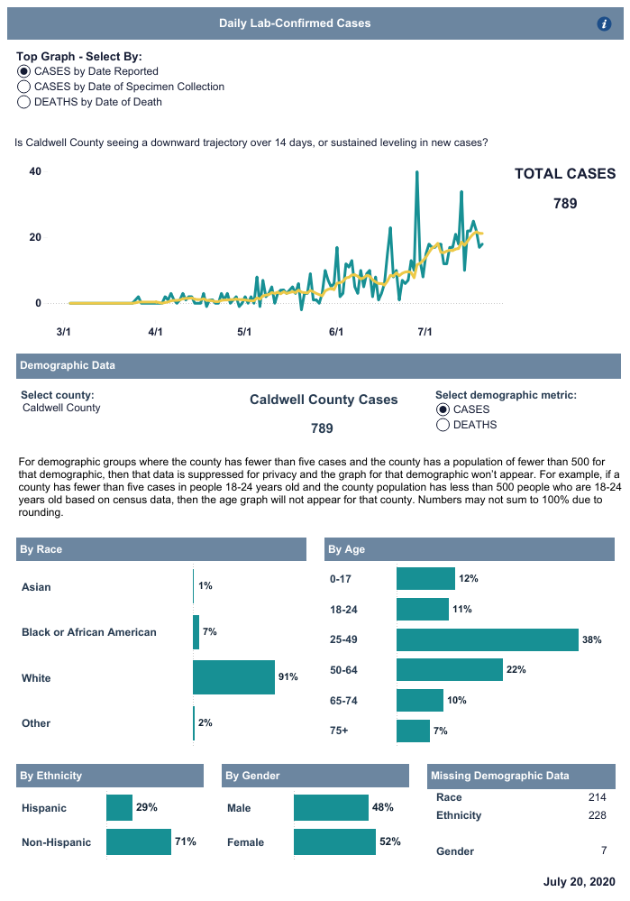 LENOIR, NC (July 20, 2020) — Here is the Caldwell County Health Department COVID-19 Update for Monday, July 20, 2020.