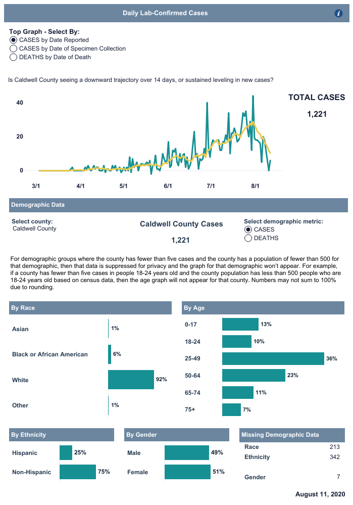 LENOIR, NC (August 11, 2020) — Here is the Caldwell County Health Department COVID-19 Update for Tuesday, August 11, 2020.