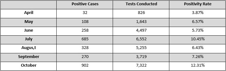 Of the 7,322 COVID-19 tests conducted in October, 902 people tested positive for a positivity rate of 12.31 percent. October marks the highest number of cases, tests conducted, and positivity rate since the pandemic began. In July, which saw the second highest number of positive cases and tests conducted, 6552 tests were conducted, and 685 people tested positive for a positivity rate of 10.45 percent.