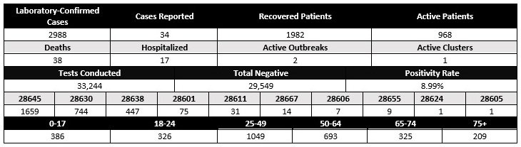 Thirty-four cases were reported today — 21 in the 28645 Zip code, 10 in 28630, two in 28638, and one in 28601. Five patients are under the age of 17; five are between 18 and 24; nine are between 25 and 49; seven patients are between 50 and 64; four are between 65 and 74; and four are over the age of 75.