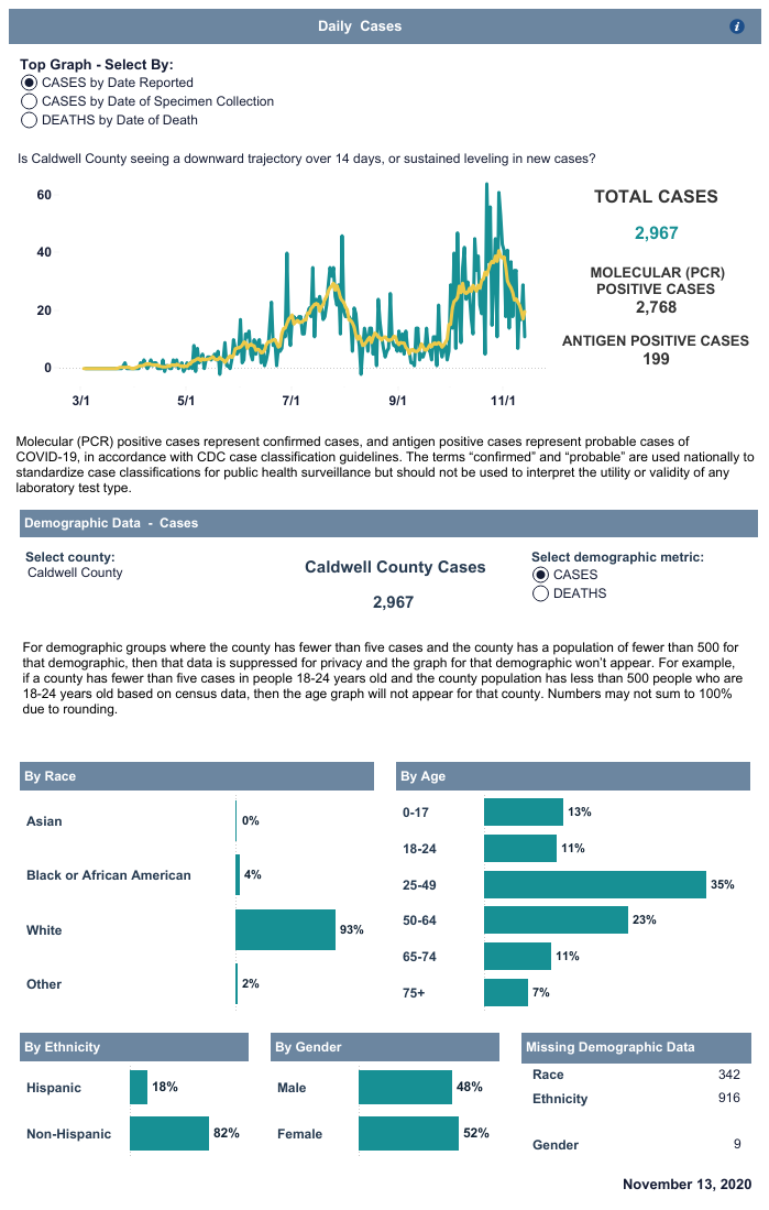 LENOIR, NC (November 13, 2020) — Here is the Caldwell County Health Department COVID-19 Update for Friday, November 13, 2020.