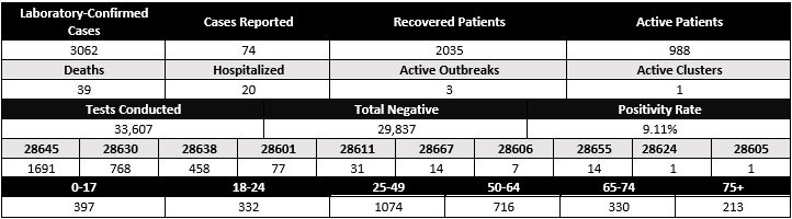 Seventy-four cases have been reported since Friday — 32 in the 28645 Zip code, 24 in 28630, 11 in 28638, five in 28655, and two in 28601. Eleven patients are under the age of 17; six are between 18 and 24; 25 are between 25 and 49; 23 patients are between 50 and 64; five are between 65 and 74; and four are over the age of 75.
