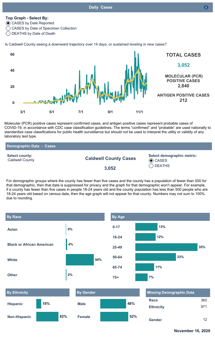 LENOIR, NC (November 16, 2020) — Here is the Caldwell County Health Department COVID-19 Update for Monday, November 16, 2020.