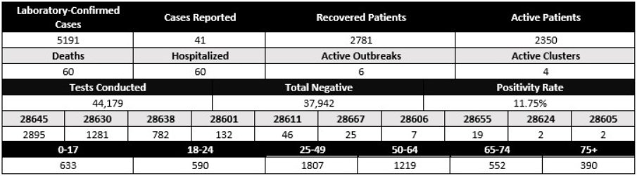 Forty-one cases — 28 in the 28645 Zip code, five in 28630, seven in 28638, and one in 28601 — were reported. Two patients are under the age of 17; two are between 18 and 24; eight are between 25 and 49; five patients are between 50 and 64; nine patients are between 65 and 74; and 15 patients are over the age of 75.