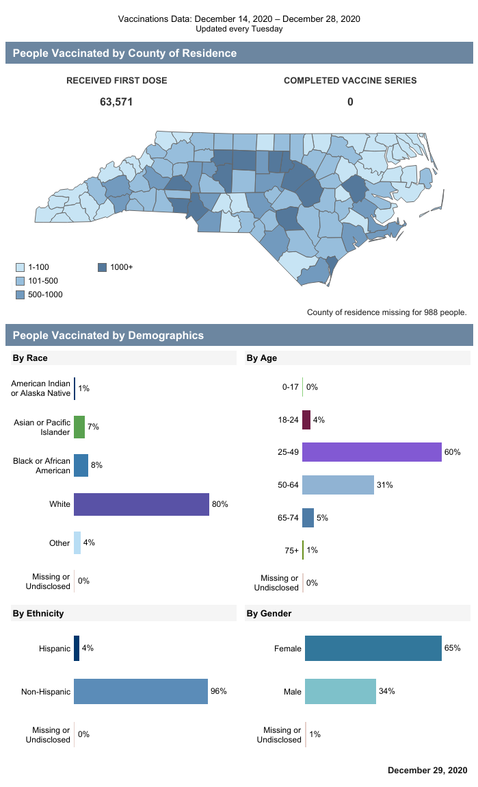 The NCDHHS COVID-19 Dashboards will not be updated on Friday, January 1, 2021 due to the state holiday. The next update will be on Saturday, January 2, 2021.