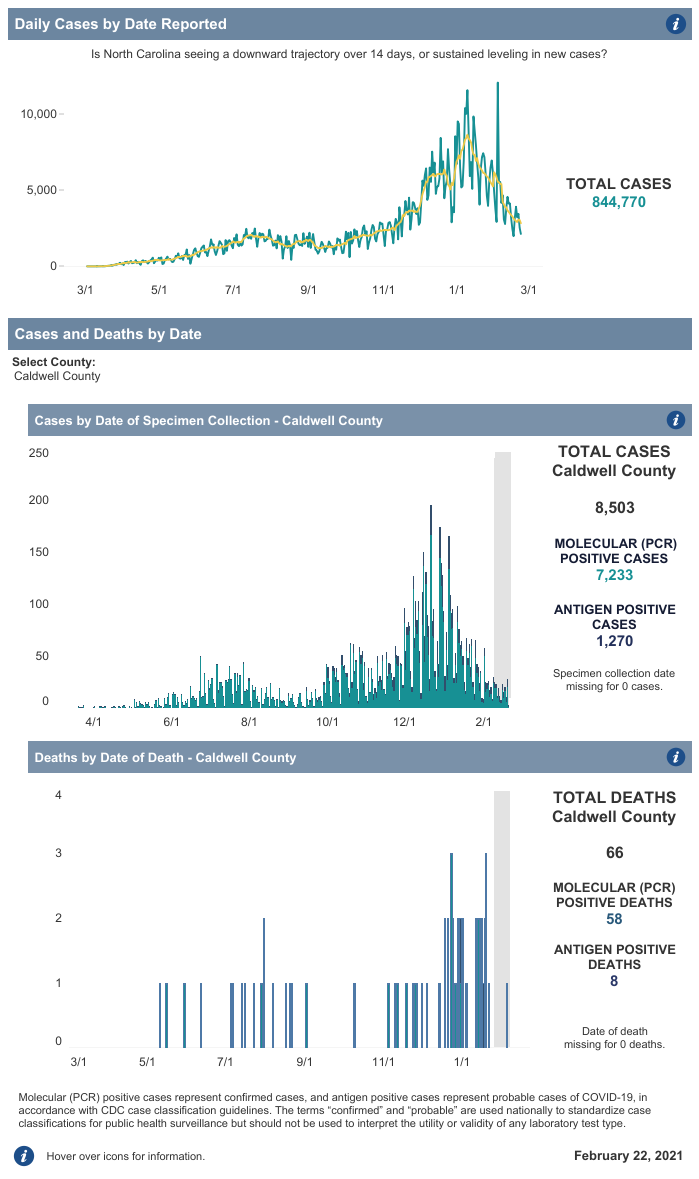 LENOIR, NC (February 22, 2021) — Here is the Caldwell County Health Department COVID-19 Update for Monday, February 22, 2021.