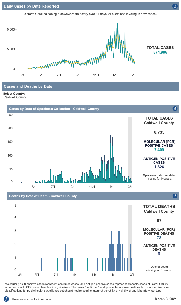 LENOIR, NC (March 8, 2021) — Here is the Caldwell County Health Department COVID-19 Update for Monday, March 8, 2021.