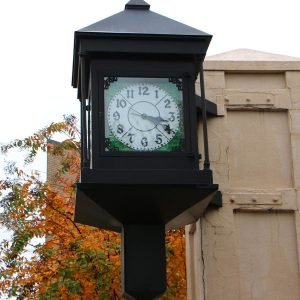 The City Clock has been part of Downtown Lenoir since the early 1920s. It was originally located on the corner of the Bank of Lenoir, which was adjacent to the current City Hall. The clock was manufactured by O.B. McClintock Co. in Minneapolis, Minnesota. It has four sides and four glass faces. The white, round dial is surrounded by green stained glass to make a square face. It was designed to be lit from within to shine white and green at night.
