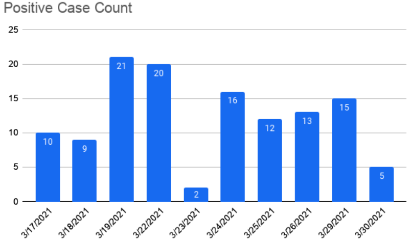 On March 2, 33 cases were reported, since then the highest number of cases reported in a single day was 21 with a daily average for March of 13.09. The last time the county experienced a lower average daily case count was September when the county reported an average of 10.80 cases per day.
