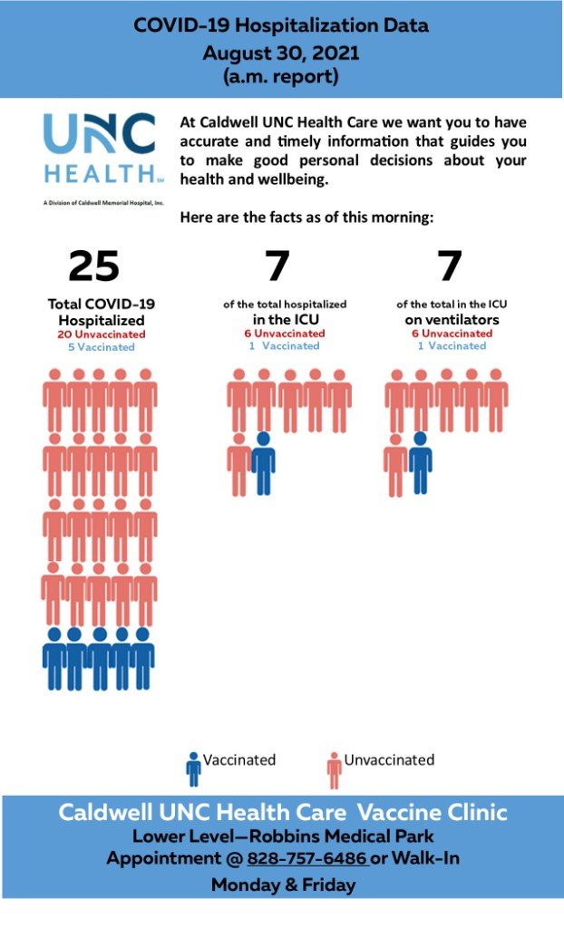 LENOIR, NC (August 30, 2021) — Here is the COVID-19 Update for Monday, August 30, 2021. The Caldwell County Health Department provides updates on Monday and Wednesday. The North Carolina Department of Health and Human Resources provides updates Monday thru Friday.