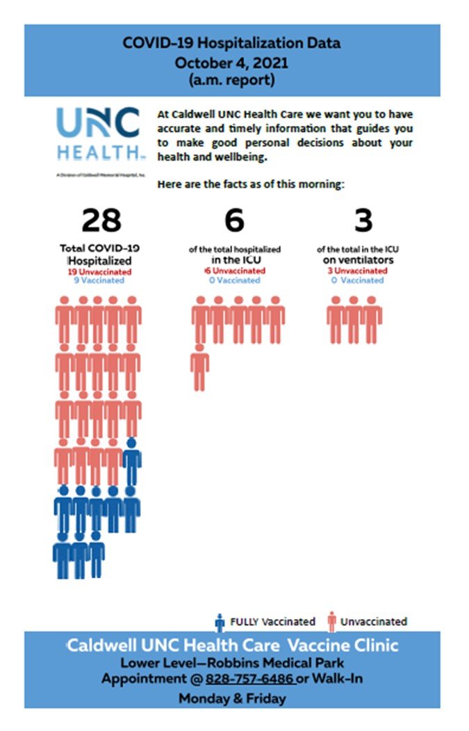 LENOIR, NC (October 4, 2021) — Here is the COVID-19 Update for Monday, October 4, 2021. The Caldwell County Health Department provides updates on Monday, Wednesday, and Friday. The North Carolina Department of Health and Human Resources provides updates Monday thru Friday.
