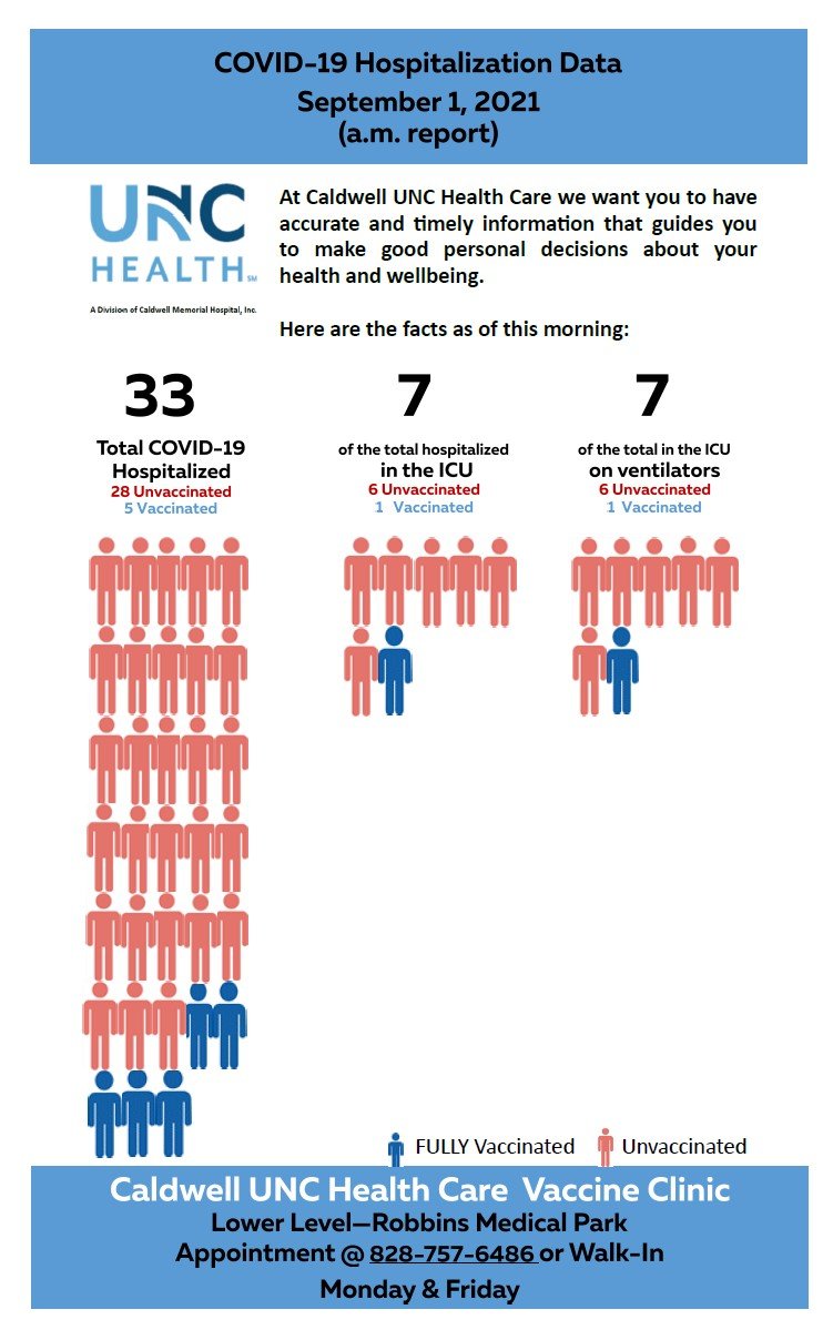 LENOIR, NC (September 1, 2021) — Here is the COVID-19 Update for Wednesday, September 1, 2021. The Caldwell County Health Department provides updates on Monday and Wednesday. The North Carolina Department of Health and Human Resources provides updates Monday thru Friday.