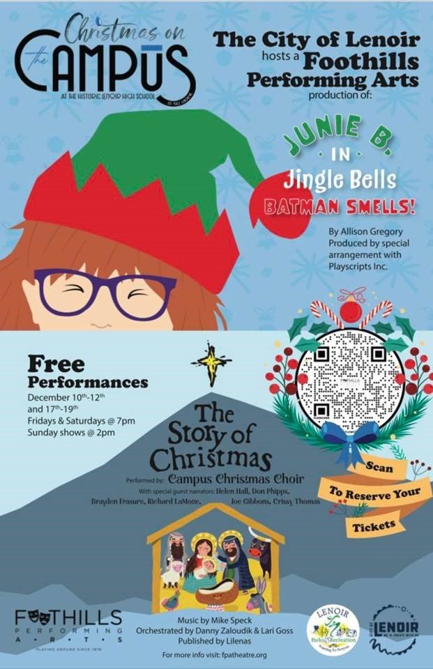 Dubbed “Christmas on the Campus at the Historic Lenoir High School,” this premier event will feature Junie B. in Jingle Bells Batman Smells!, The Story of Christmas performed by the Campus Christmas Choir, and musical performances. The show dates are Friday, Dec. 10, Saturday Dec. 11, Sunday Dec. 12, Friday Dec. 17, Saturday Dec. 18, and Sunday Dec. 19.