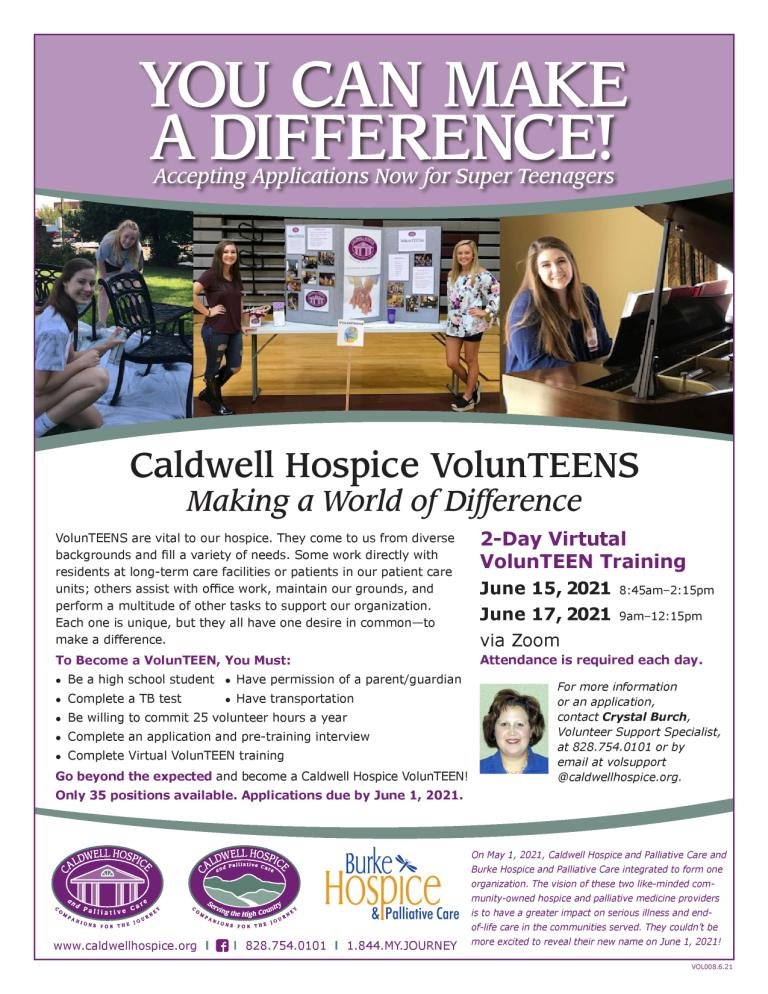 For more information, or to obtain an application, contact Volunteer Support Specialist Crystal Burch at 828.754.0101 or volsupport@caldwellhospice.org. Applications are also available from VolunTEEN club sponsors in Caldwell County high schools. Only 35 positions are available. Applications are due by June 1, 2021.