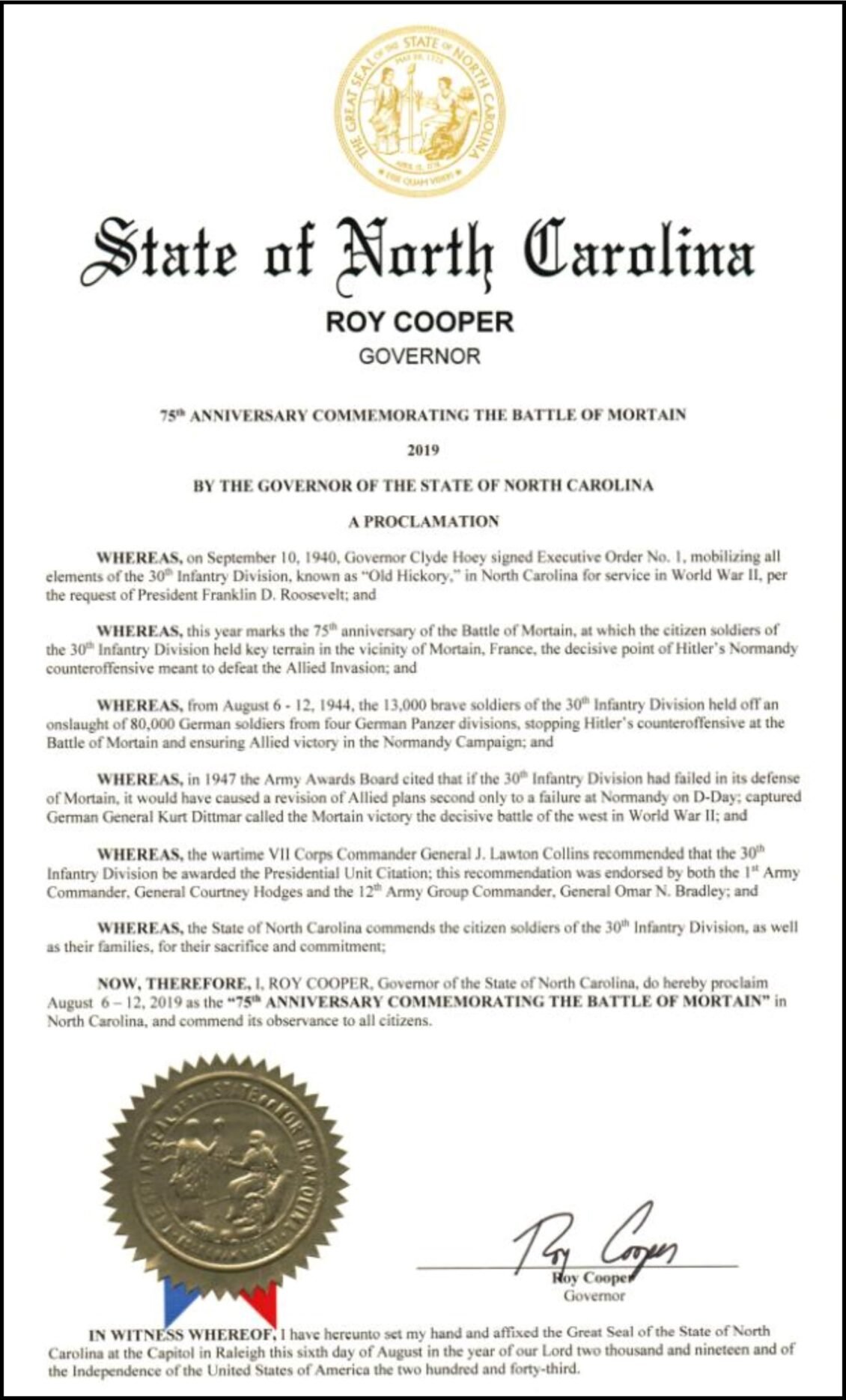 RALEIGH, NC (August 7, 2019) — On Tuesday, August 6 Governor Roy Cooper presented to the North Carolina National Guard a proclamation commemorating the WWII Battle of Mortain which occurred August 7-13, 1944.