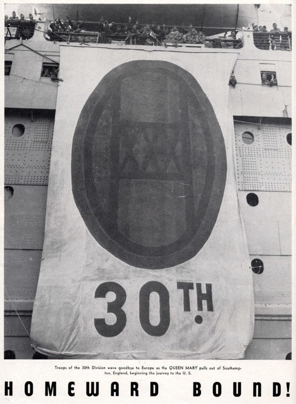 The 30th Infantry Division sets sail for home on the Queen Mary and other ships, August 1945. Col. S.L.A. Marshall, Gen. Eisenhower’s chief historian in the European Theater of Operations (ETO) ranked the 30th as the No. 1 division in its category in the ETO. (Photo courtesy of 30th Infantry Division Association)