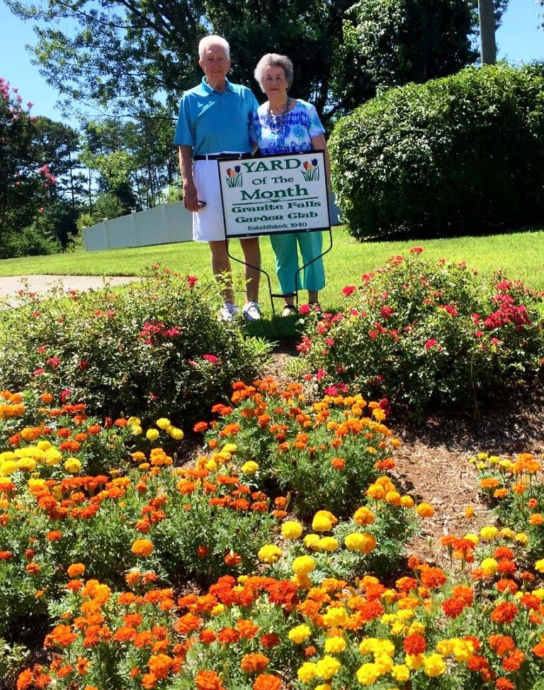 GRANITE FALLS, NC (July 11, 2018)…One year after a tornado toppled two Bradford Pear trees in the yard of DC and Vonda Hefner in Granite Falls, the Granite Falls Garden Club Awarded the Hefner’s with Yard Of The Month for July 2018. Their shrubs and lawn are well manicured. Marigolds, periwinkle and knockout roses are currently blooming in beds around the house. Appropriately for July, the home and gardens are tastefully decorated in a patriotic theme. The backyard is a shaded oasis with large shade trees, magnolia and evergreens. A special attraction is their outdoor pond stocked with bright goldfish. The award was presented by Garden Club members Sherry McGill and Teresa Jackson.
