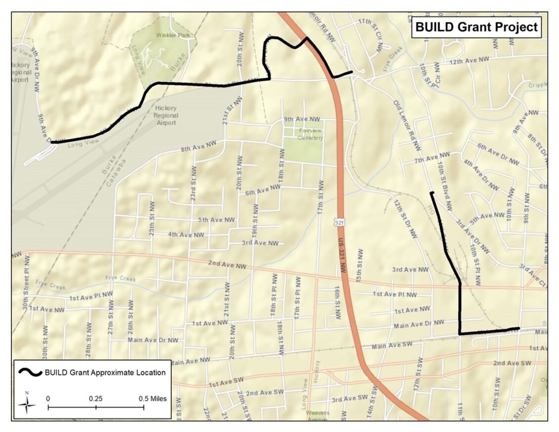 “The project funded by the BUILD grant is an extension of Hickory’s current bond program to activate various parts of the City through multi-modal path interconnection,” said Hickory City Manager Warren Wood. “This new project connects the City Walk to the Old Lenoir Road streetscape, and complements the City’s Riverwalk by providing a vital link across U.S. 321 to L.P. Frans Stadium, home of the Hickory Crawdads, and the Hickory Regional Airport.”