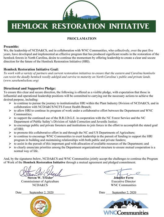“The proclamation further cements the partnership between the Department of Agriculture and WNC Communities, and it serves as a promise for the future of the Hemlock Restoration Initiative,” Ferre said.