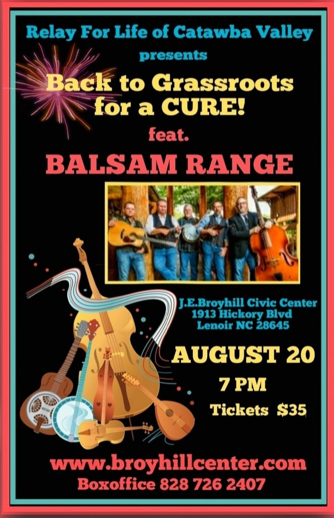 Join us AUGUST 20 as Relay For Life of Catawba Valley presents BALSAM RANGE!! Get your tickets reserved! Tickets are $35 and can be ordered online: www.broyhillcenter.com or box office 828 726 2407 Event page link: https://fb.me/e/7rsmjO6hj
