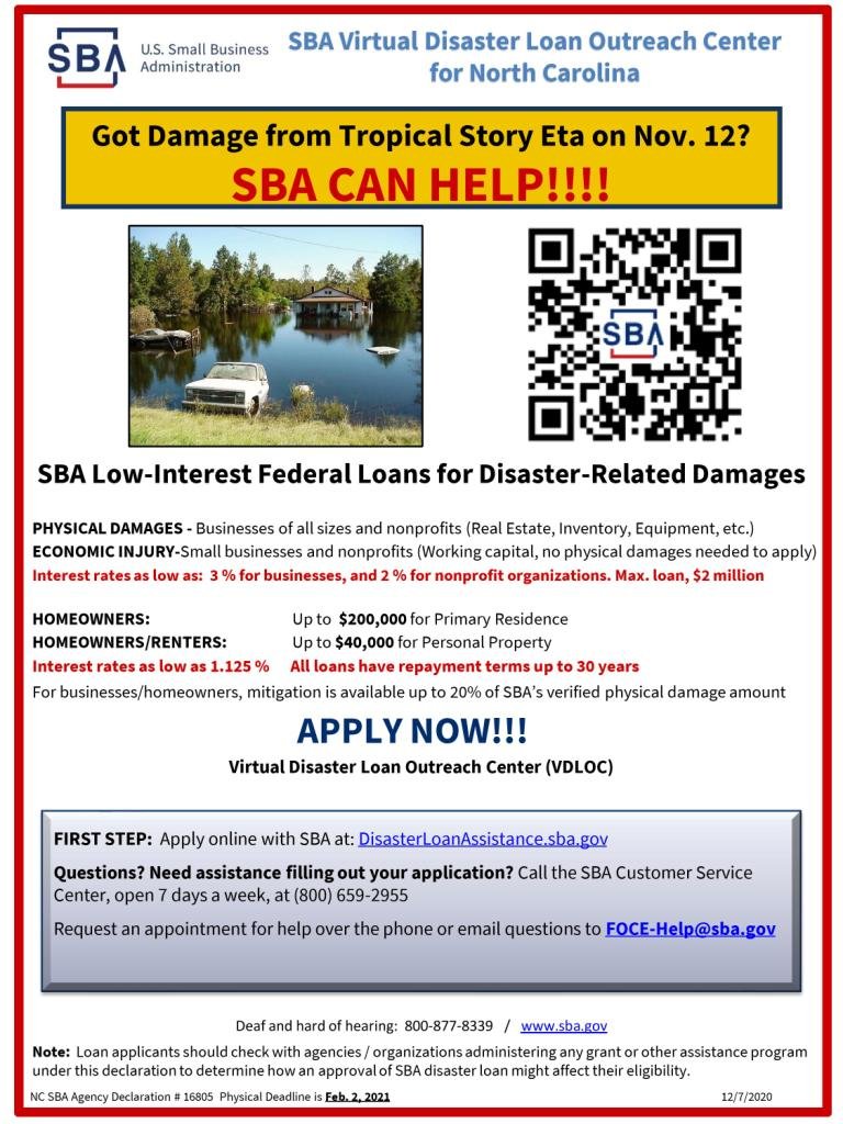 WASHINGTON, DC (December 7, 2020) — North Carolina businesses and residents affected by Tropical Storm Eta on Nov. 12, 2020, can apply for low-interest disaster loans from the U.S. Small Business Administration, Administrator Jovita Carranza announced today.