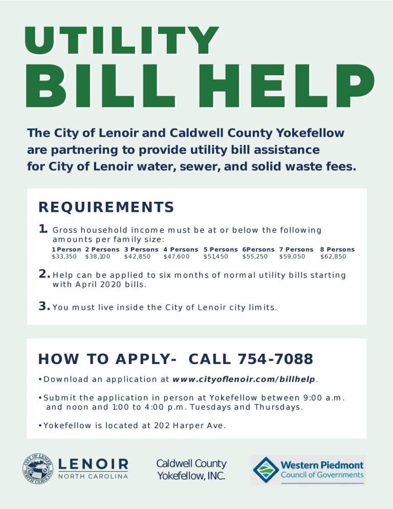 LENOIR, NC (August 26, 2020) — The City of Lenoir and Caldwell County Yokefellow, Inc., are partnering to provide utility bill assistance for City water, sewer, and solid waste fees.