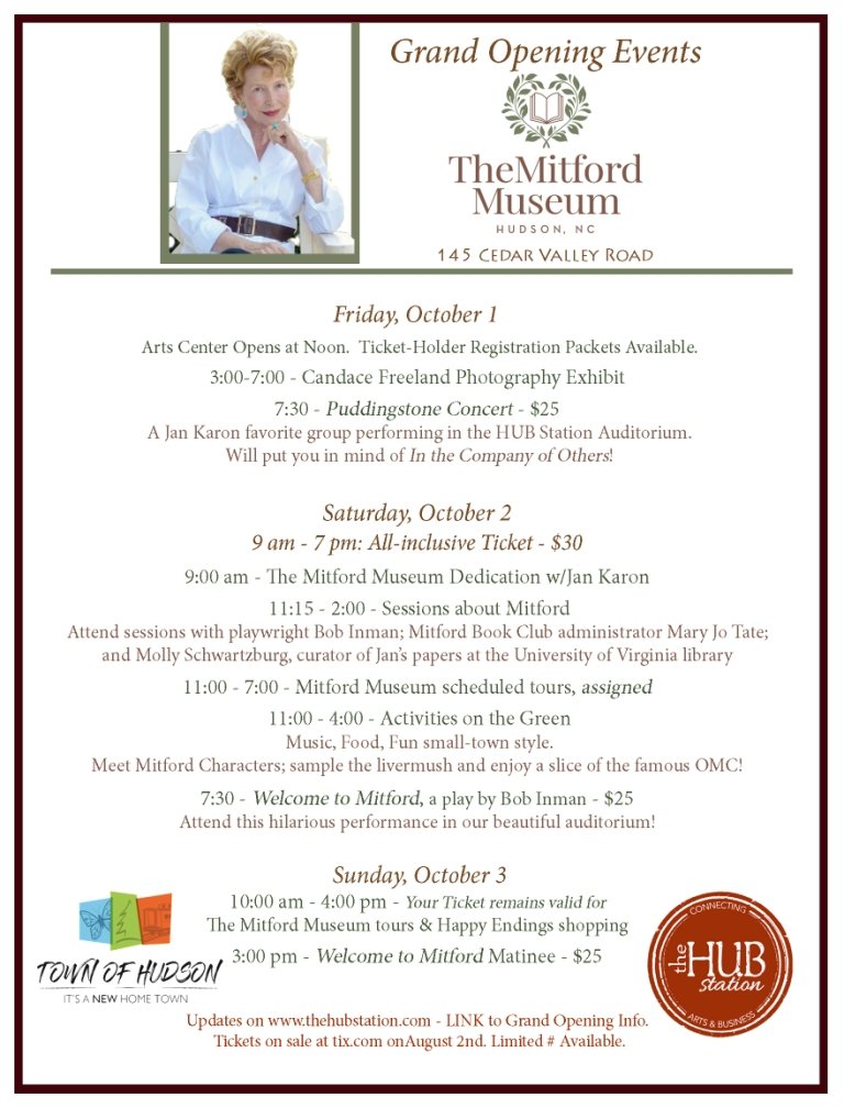HUDSON, NC (September 20, 2021) — The play, “Welcome to Mitford,” opens this Friday, September 24th and runs Friday and Saturday, September 25th and Saturday and Sunday, October 2nd and 3rd. The first three shows are at 7:30 PM and the final performance is a Sunday 3:00 PM matinee. “Welcome to Mitford,” compiled by Bob Inman, is based on the Mitford series of novels by New York Times best-selling author, Jan Karon. It follows the journey of Father Tim Kavanagh, as he intermingles with the fine citizenry of Mitford. Tickets are $25 and may be obtained by going to the HUB Station Box Office at 145 Cedar Valley Road, by calling (828)726-8871 or by going online to the Town of Hudson website and following the link to tix.com. For more information, please call the above number, (828)726-8871.