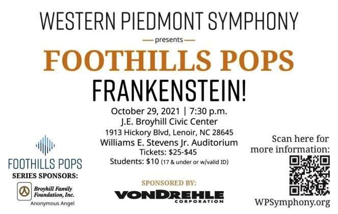 HICKORY, NC (October 18, 2021) — The Western Piedmont Symphony presents Frankenstein! This is a screening of the 1931 classic film with a live orchestra performing the score. The concert is at 7:30 p.m. on October 29, 2021, at J.E. Broyhill Civic Center. It is the first ever of the Foothills Pops concert series presented by the Western Piedmont Symphony.